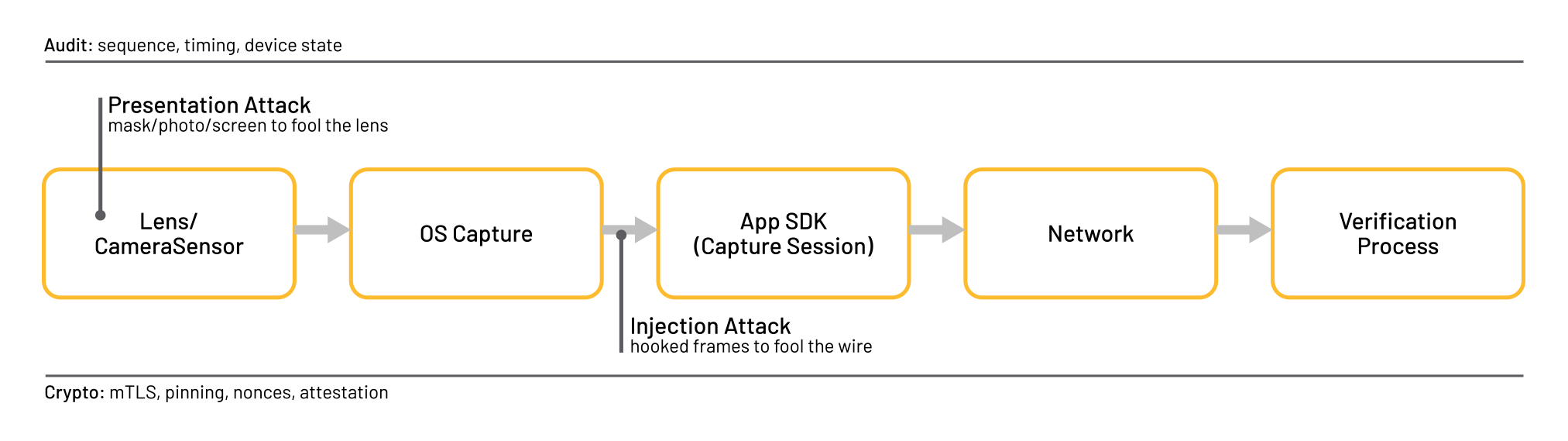 Conventional presentation attacks are distinct from digital injection attacks. Presentation attacks attempt to deceive the lens by displaying a masked disguise, a printed photo, or a replay on a screen. Injection attacks attempt to deceive the ‘wire’ by inserting or rerouting frames within the capture pipeline following the lens. This distinction is significant because the defenses are not identical, despite the fact that they do somewhat overlap. For example, both attack types must defeat liveness checks. It is possible to pass a fundamental ‘is the face moving’ liveness check with either method, but your application may still be vulnerable to injection attacks if it admits pixels that were not produced by the actual sensor.